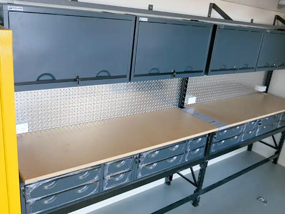 Arbeitsbänke 2x Stahl-Werkbanksystem mit Schubladeneinheit & Oberschränken