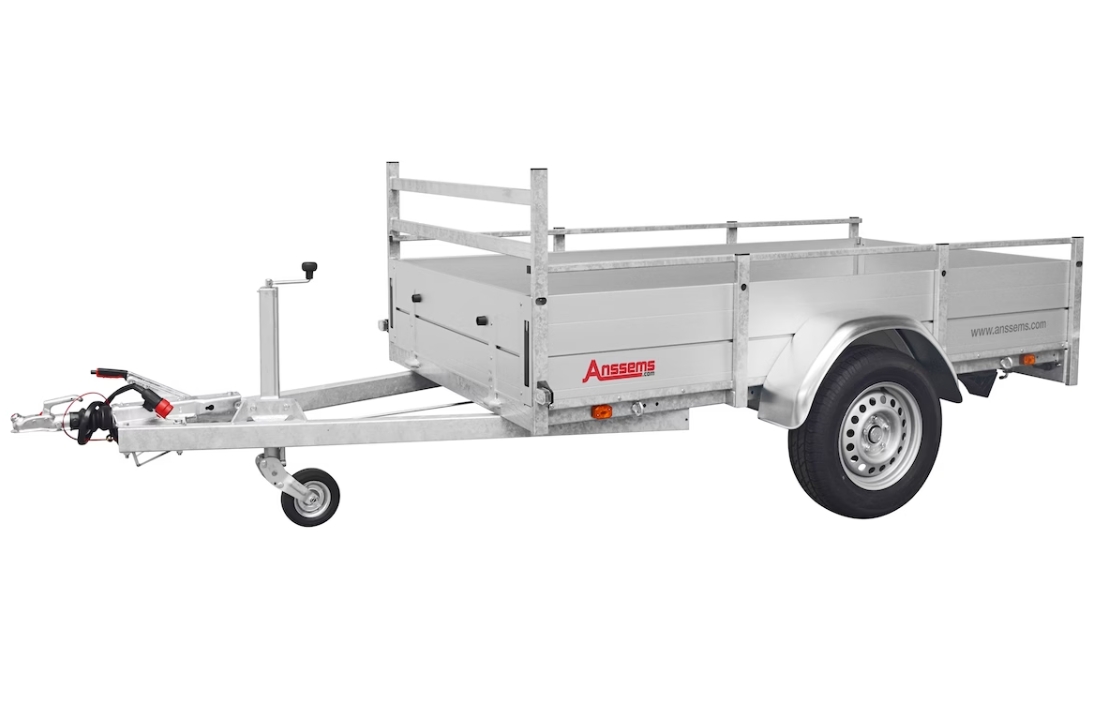 ANSSEMS Kastenanhänger mit stabilem, verschweißten Rahmen, serienmäßig ausgestattet mit verschweißter Stahlreling und Vordergitter, klappbarer Vorder- und Hinterbordwand, Ausziehrohren zur Ablage der Hinterbordwand, Seitenbeleuchtung, 4 Bindeösen, Automatikstützrad und rutschfestem Holzboden.